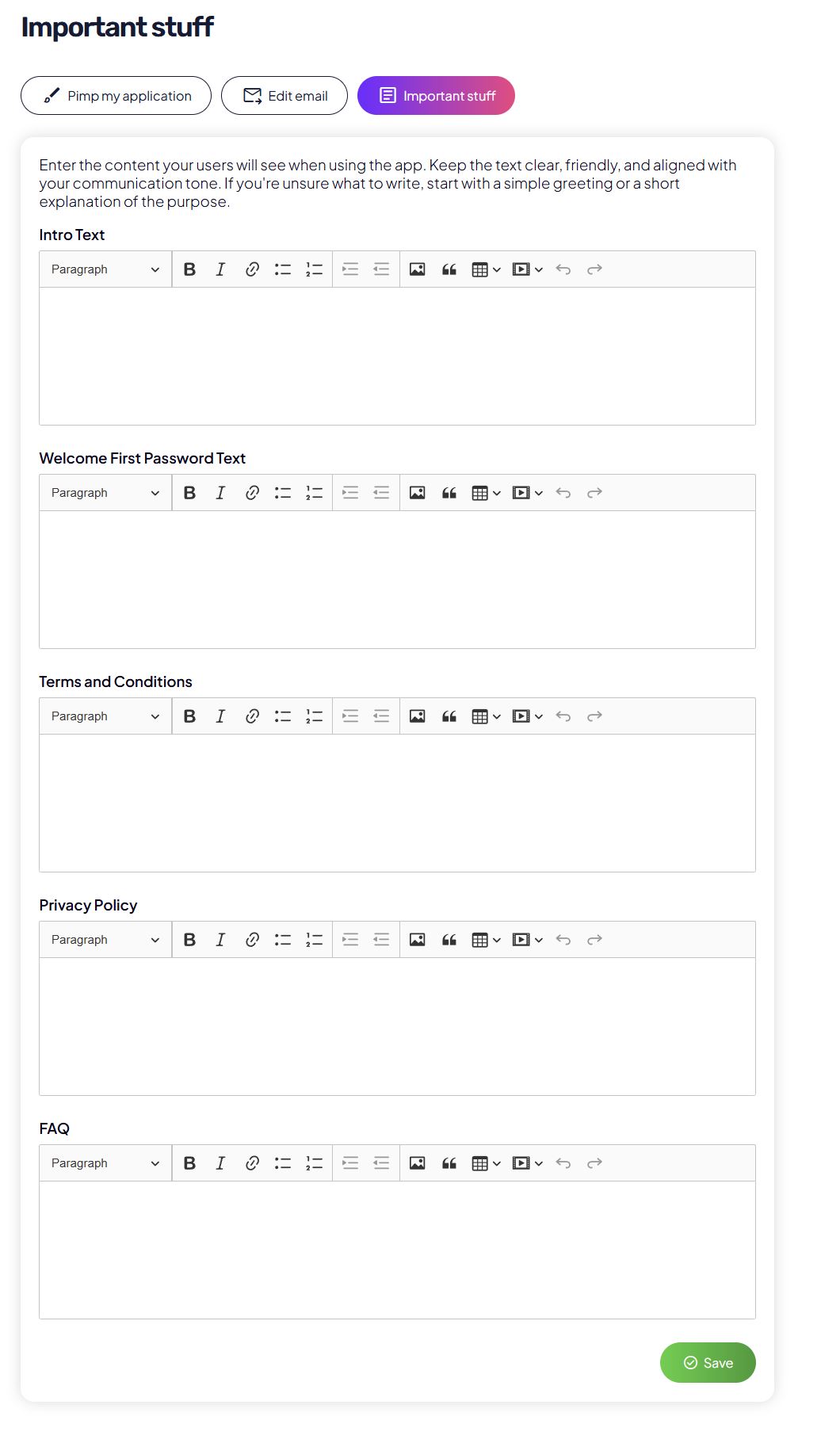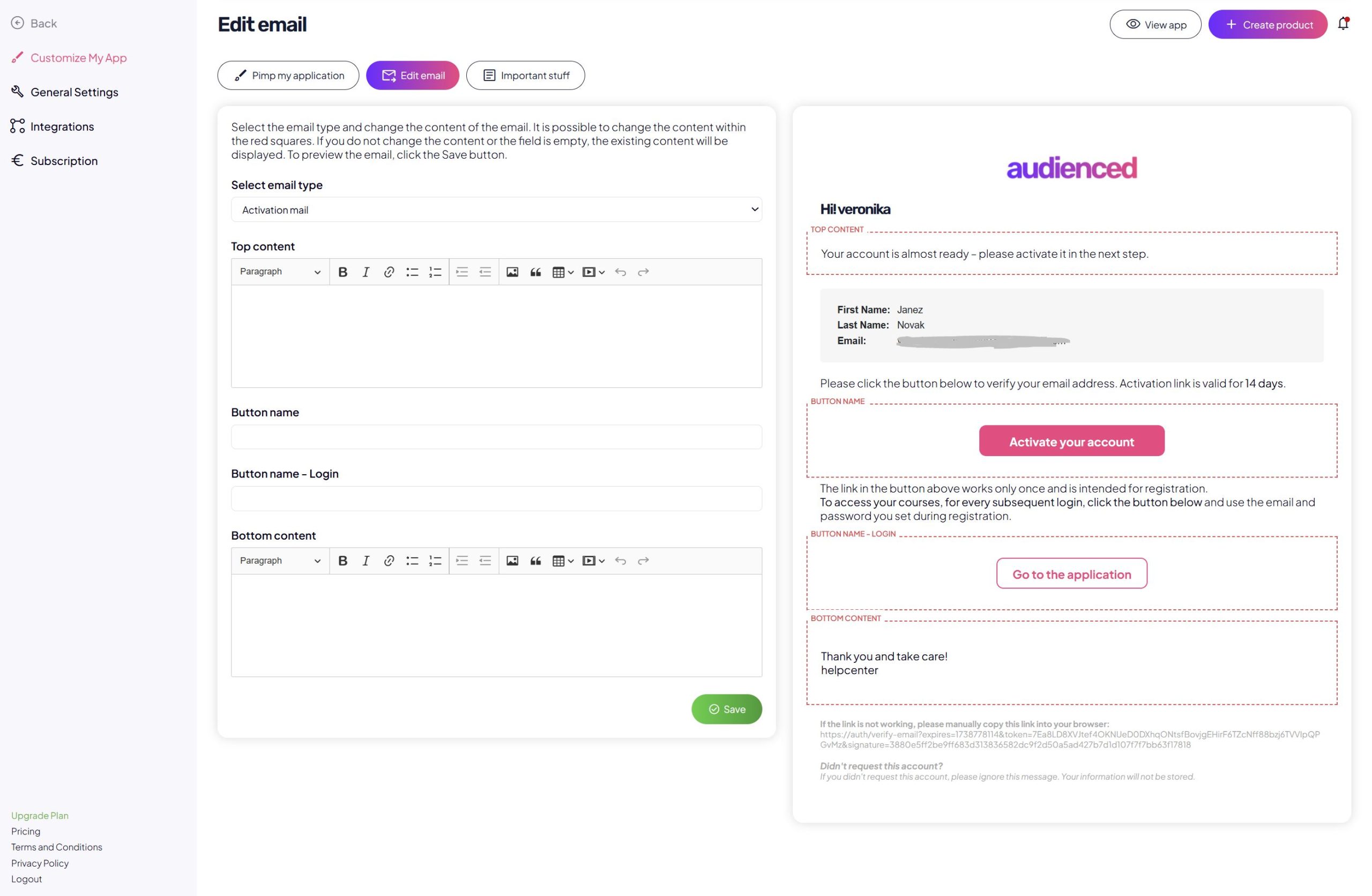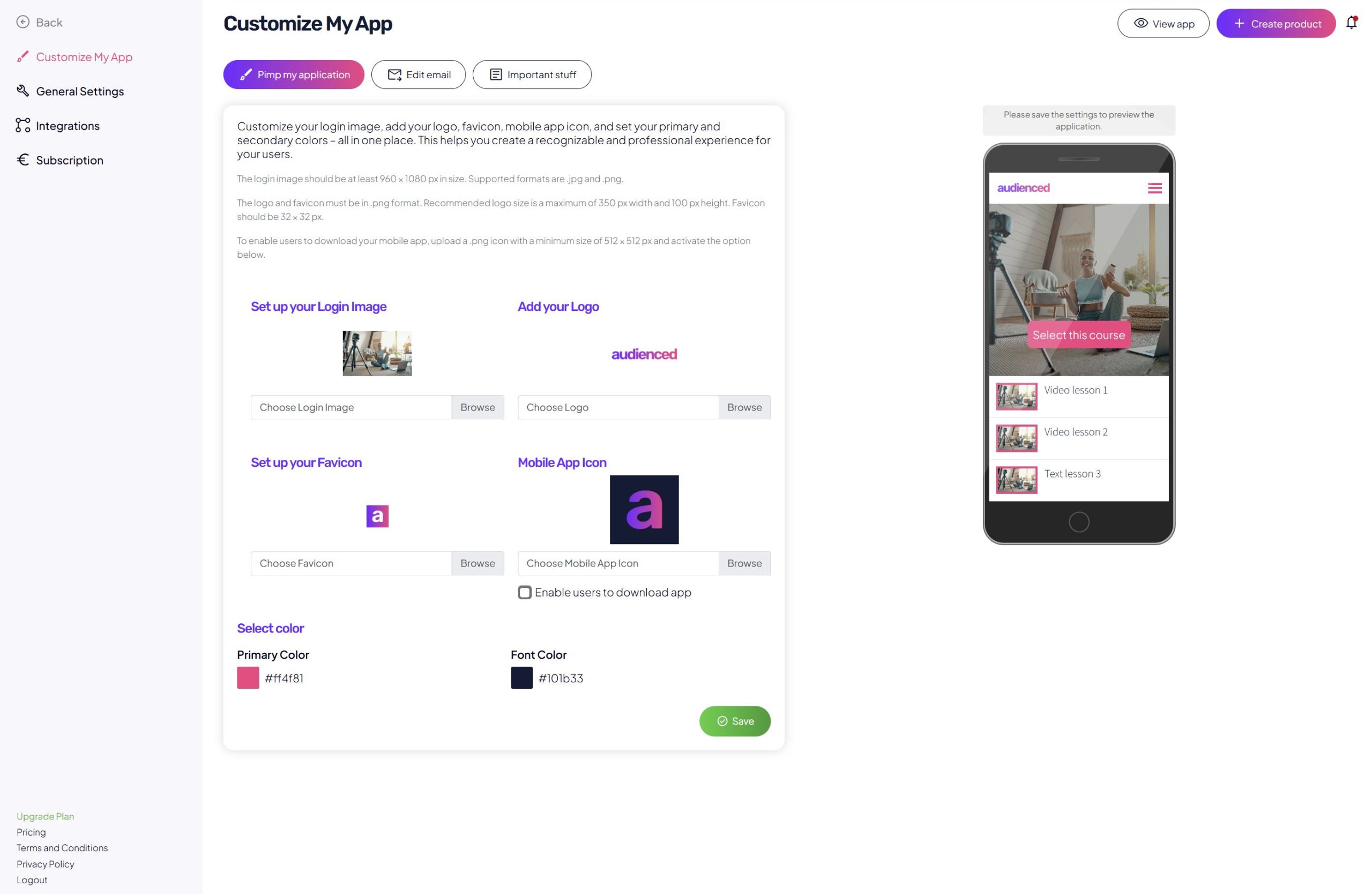 In audienced, you can customize the application to match your brand, communication tone, and the way you work with users. All personalization settings are available in the Edit my application section.