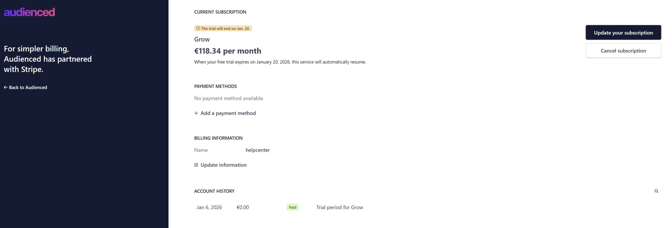 In Audienced, you can change your plan (Starter / Grow / Scale) at any time directly from the dashboard. The change is applied without losing any data or settings.