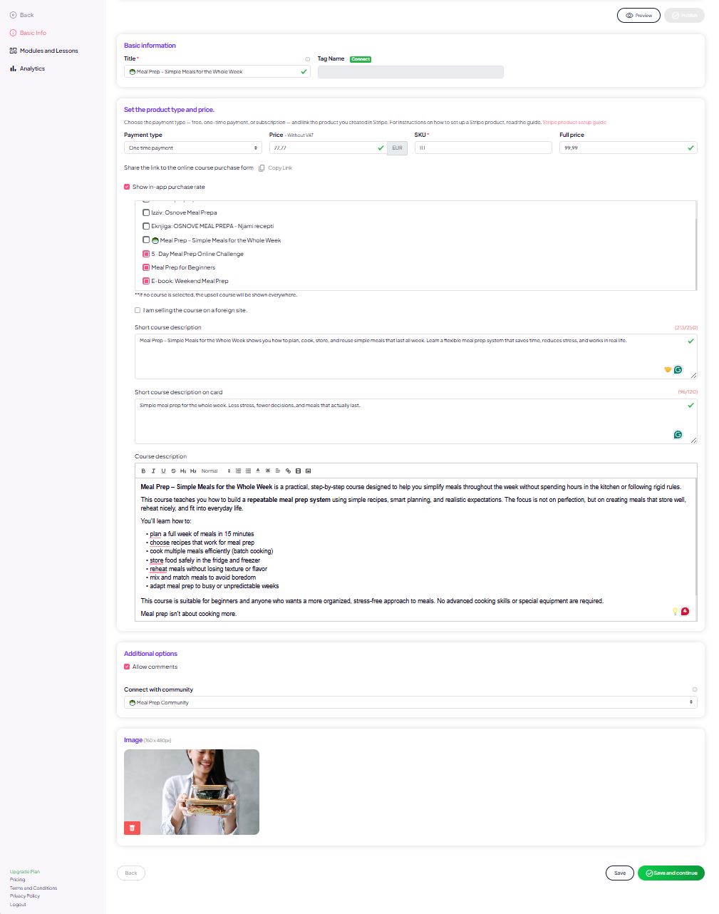 This section defines how the course is displayed to users and how they can access or purchase it.