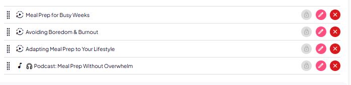 You can use drag & drop on both modules and lessons. Click and hold the selected lesson or module on the eight-dot icon to the left of its name and drag it to the desired position.