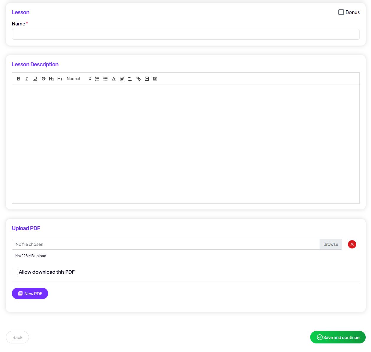In the Lesson description section, you can add an introductory explanation or instructions for using the PDF.