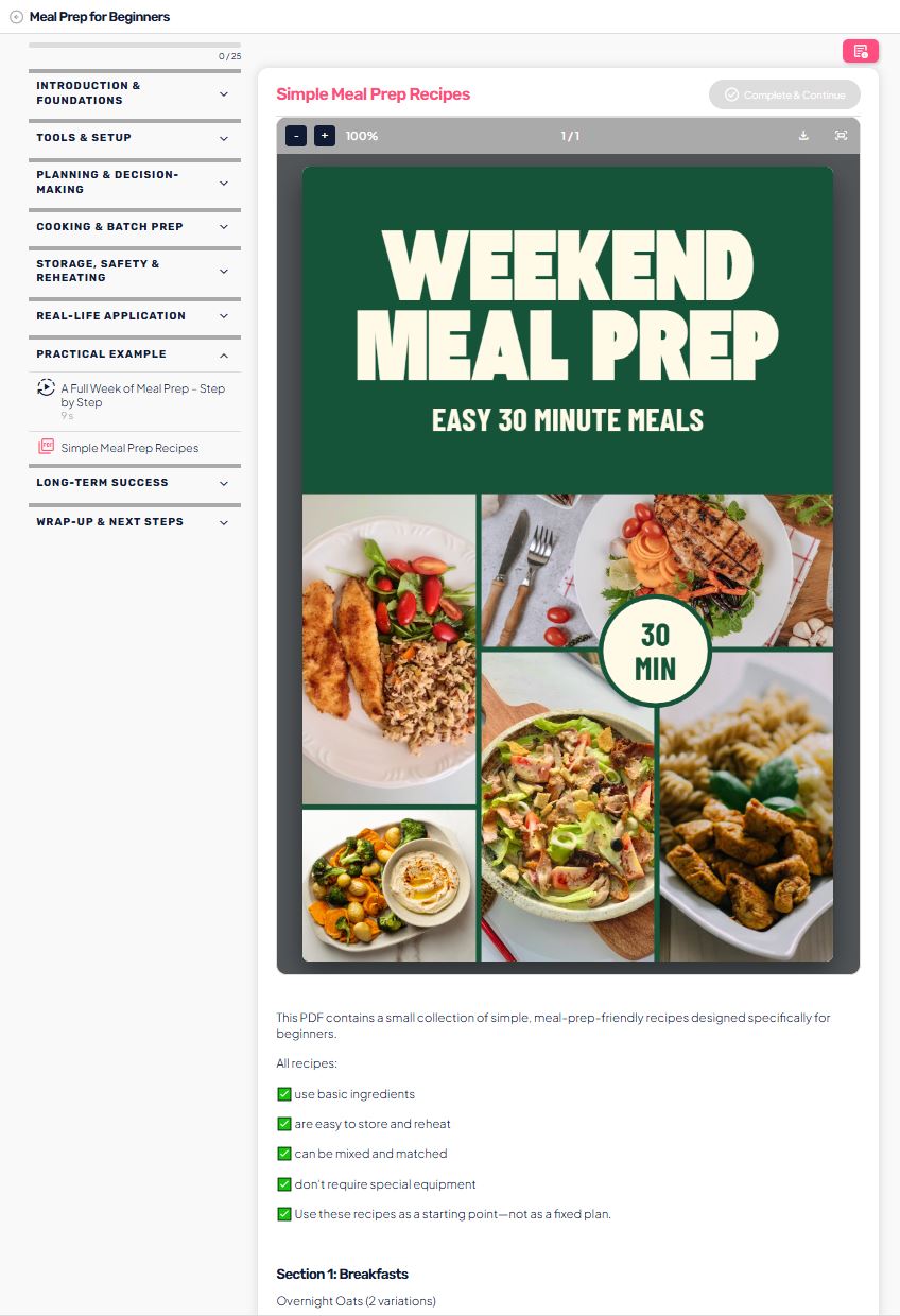 A PDF lesson in Audienced is designed for content where you want to provide users with a document in PDF format—such as e-books, recipes, worksheets, manuals, or additional materials. The PDF is displayed directly within the lesson and can serve as either the main or a supplementary part of the content.